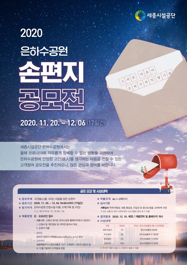 세종특별자치시시설관리공단(이사장 계용준, 이하 공단) 은하수공원이 20일부터 내달 6일까지 손편지 공모전을 실시한다고 밝혔다.