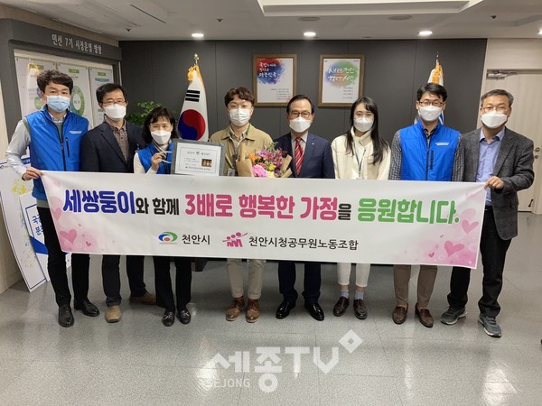 천안시청공무원노동조합(위원장 이근수)이 지난 20일 조합원 중 지난달 세쌍둥이 아빠가 된 진원홍 주무관(농업기술센터 농촌지도사)을 위한 축하의 자리를 마련했다.