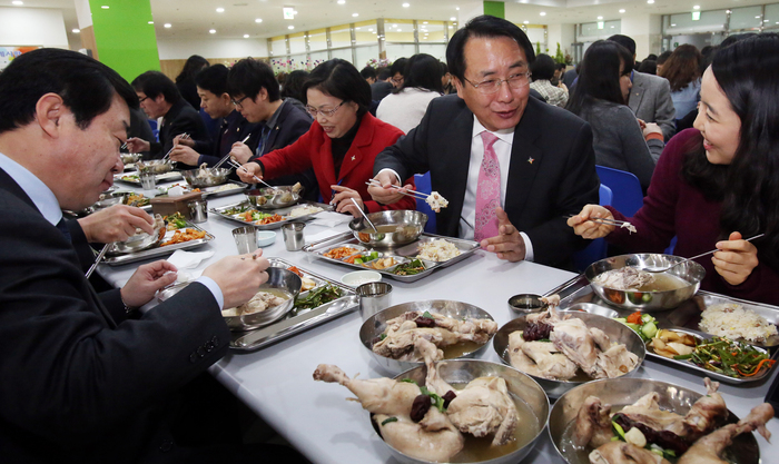 대전 동구(구청장 한현택)가 AI로 인한 축산농가의 고통을 분담하고, 적절한 조리시 안전하다는 올바른 인식 홍보를 위해 21일 구청 후생관에서 삼계탕 시식행사를 가졌다.