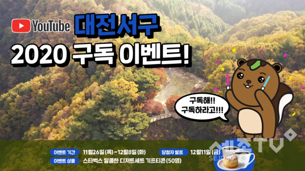 대전 서구(구청장 장종태)는 25일부터 공식 유튜브 채널 ‘대전서구’와 서브 채널 ‘서구청 정부미’의 구독 이벤트를 각각 진행하고 추첨을 통해 경품을 제공한다.