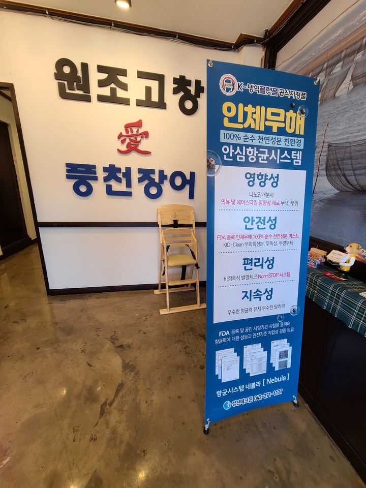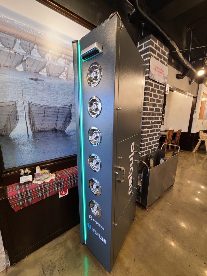 이 식당에는 K-방역플랫폼 공식지정제품인 슬림형 방역시스템인 ‘네블라’가 설치돼 있다. 코로나19 등 각종 바이러스 침투를 억제하는 고급형 방역기계로 FDA 등록 및 공인시험기관 시험 검증받은 방역기계이다.