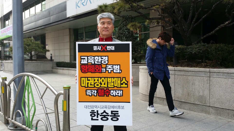 대전시 교육감 출마 후보자인 한숭동 전 대덕대 총장(62)이 24일 오후 대전시 서구 월평동 마권장외 발매소 앞에서 ‘마권장외 발매소 확장 반대 및 퇴거’를 위한 1인 시위를 가졌다. <사진>