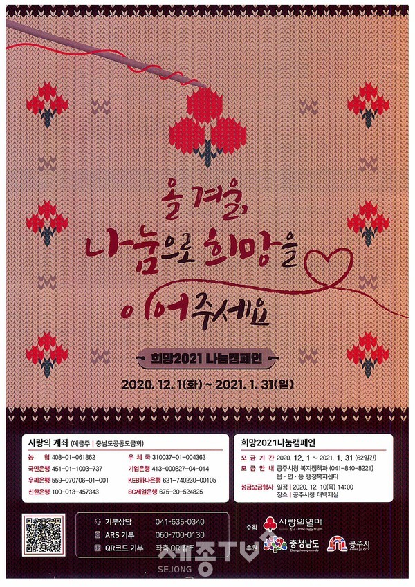 공주시(시장 김정섭)가 연말연시를 맞아 12월 1일부터 2021년 1월 31일까지 두 달간 ‘희망 2021 나눔 캠페인’을 진행한다고 2일 밝혔다.
