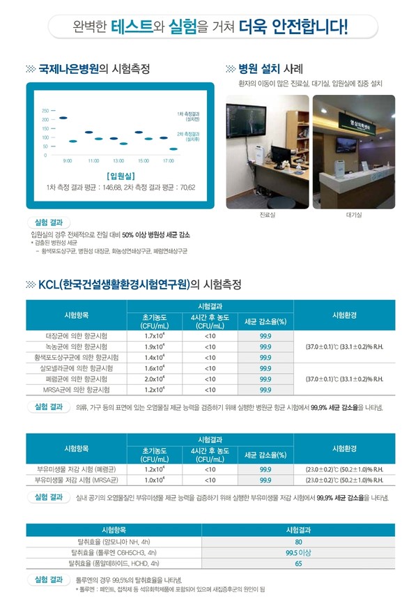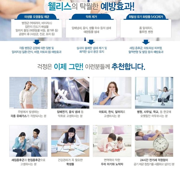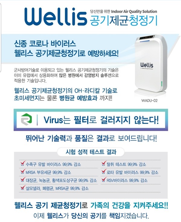 공기 제균 청정기의 효과는 지난해 국제적인 기관을 통해 증명됐다. 지난해 스페인 바르셀로나대 바이러스연구소에 성능을 의뢰한 결과 웰리스를 사용하면 호흡기 세포융합바이러스(RSV)와 로타바이러스를 2시간 만에 99%까지 제거할 수 있다는 시험 결과를 받았다.