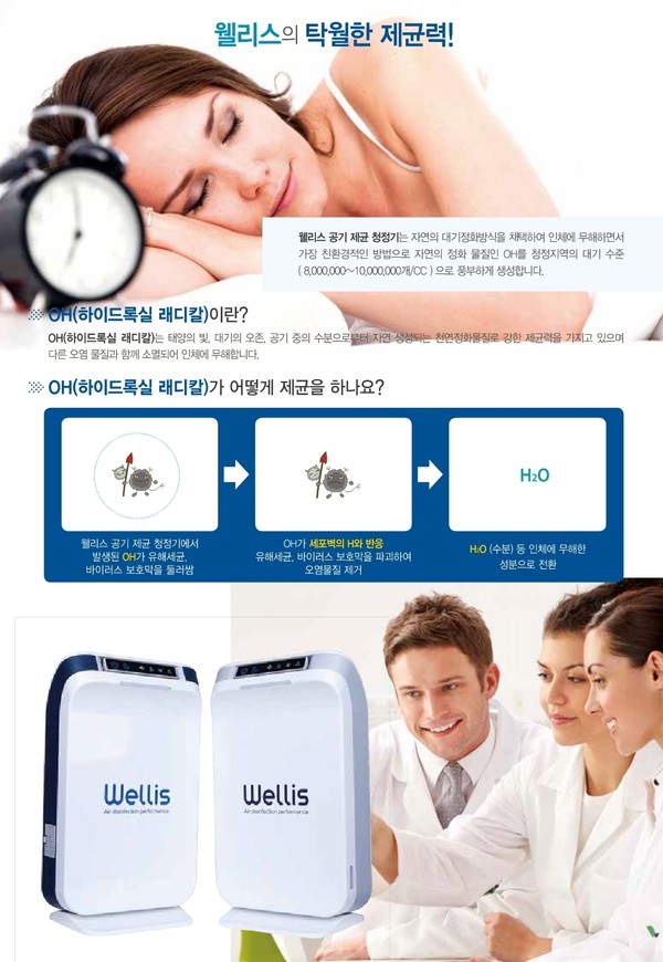 웰리스의 공기 제균 청정기는 공기 중에 떠 있거나 사물 표면에 붙어 있는 바이러스와 박테리아 등 전염성 병원균 등을 제거하는 물질인 ‘OH라디칼’을 생성하는 제품이다. OH라디칼은 공기 중에 오존과 과산화수소가 결합할 때 나오는 성분으로 인체에는 무해하며 오염물질을 제거하는 효과가 있다. 냉전시대 생화학무기로 인한 대응책으로 영국의 리즈대에서 발견했다.