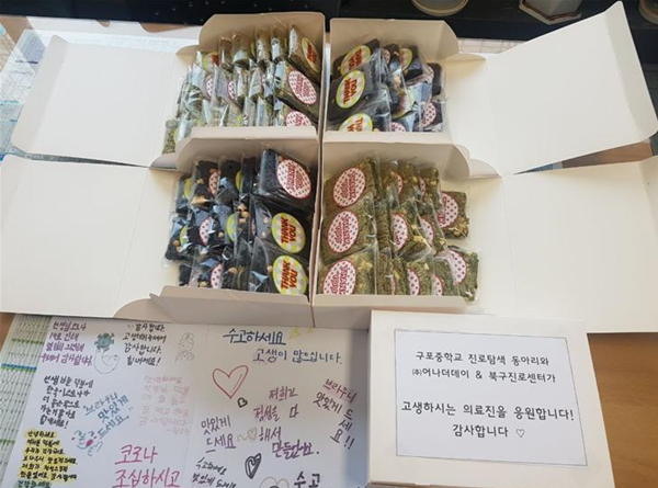 이어 구포중학교 선생님은 “최근 요양병원 집단감염 발생 등으로 연일 고생하는 직원들에게 감사의 마음을 전하고 싶어 작은 선물을 준비했다”라고 말했습니다.