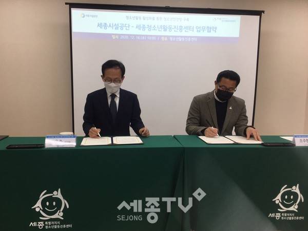 세종특별자치시시설관리공단(이사장 계용준, 이하 공단)은 16일 오전 10시 세종시청소년활동진흥센터(센터장 조주환)에서 신종 코로나바이러스 감염증(코로나19)으로 인해 위축된 청소년의 온·오프라인 연계프로그램을 공동 모색하고 확산하기 위한 업무협약을 체결했다고 밝혔다.