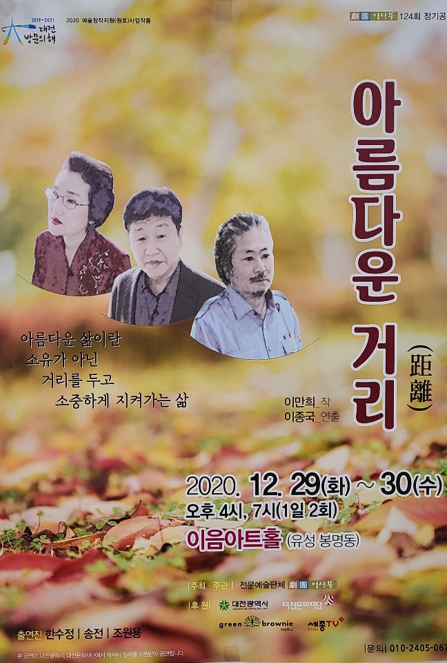 오후 4시와 7시 일일 2회 갖는 이번 공연은 제124회 정기공연으로 이만희 작, 이종국 연출의 ‘아름다운 거리(距離)’ 작품이 무대에 올려진다.