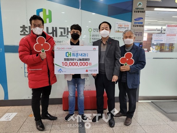 아름동은 지난 23일 최훈내과의원에서 최훈 원장과 여상수 아름동장, 김동후 세종사회복지공동모금회 사무처장 등이 참석한 가운데 ‘희망2021 나눔캠페인’ 성금 전달식을 가졌다.