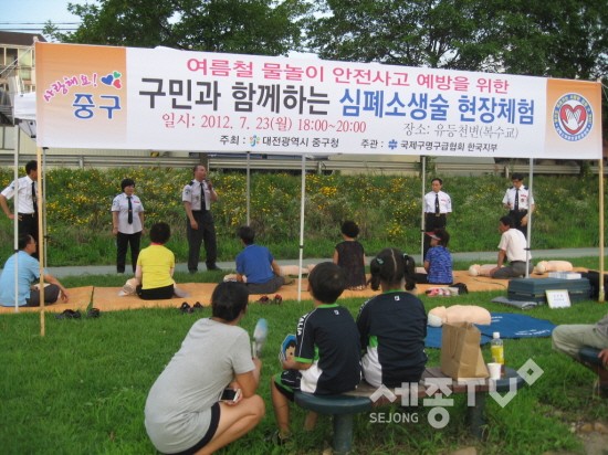 대전 중구는 여름철 물놀이 안전사고 예방 및 응급상황에 신속하게 대처하기 위해 “구민과 함께하는 심폐소생술 현장체험” 행사를 23일 유등천 복수교 주변 잔디광장에서 개최했다.
