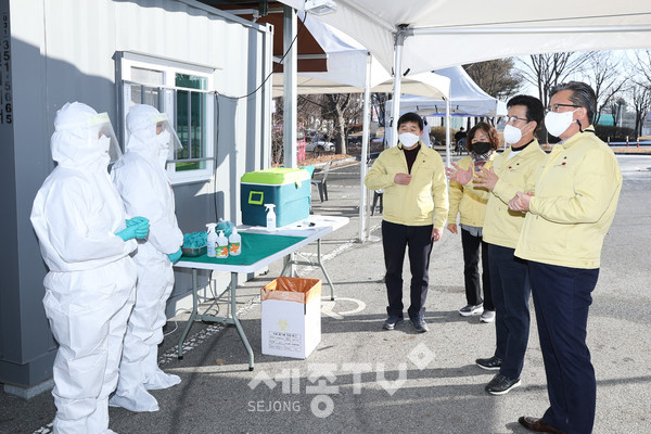 이어, 유성구 선별진료소를 찾은 허태정 시장은 선별진료소 운영현황과 애로사항 등을 청취한 뒤 근무자들을 격려하며 감사의 뜻을 전했다.