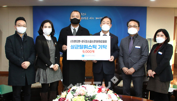 대전광역시교육청(교육감 설동호)은 12월 28일(월)에 (주)엔오엔(대표 우덕구)과 한국호스피스완화의료협회(본부장 이수연)로부터 코로나 19 방역용 살균탈취스틱을 기탁받았다고 밝혔다.