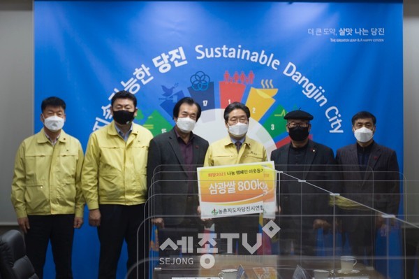농촌지도자당진시연합회(회장 한천우)는 12월 29일 오전 11시에 어려운 이웃돕기 농산물로 회원들이 직접 재배한 삼광벼 쌀 800kg을 당진시(시장 김홍장)에 전달했다.