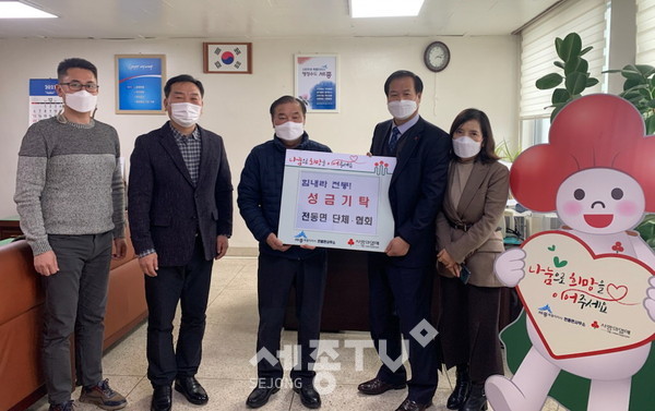 세종특별자치시 전동면(면장 전만익)의 주민자치회, 이장협의회 등 단체·협회가 연말을 맞이해 30일 전동면사무소에서 소외계층을 위해 성금 100만 원을 기탁하고 ‘희망 2021 나눔캠페인’에 동참했다.