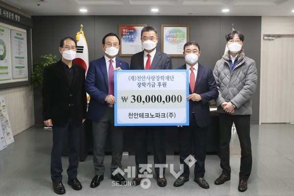 천안사랑장학재단(이사장 박상돈)은 지난 12월 30일 시청에서 천안테크노파크 주식회사(대표 강창록)가 지역의 미래인재 육성을 위한 장학금 3,000만원을 후원했다고 밝혔다.