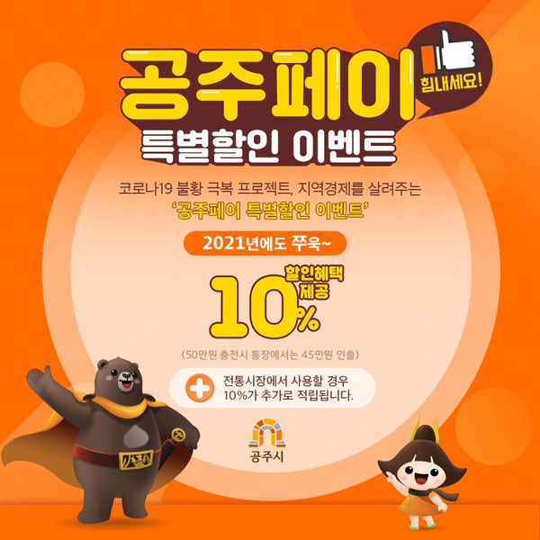 공주시(시장 김정섭)는 모바일 지역화폐인 ‘공주페이’ 10% 특별할인 이벤트 기간을 올해 말까지 1년 연장한다.