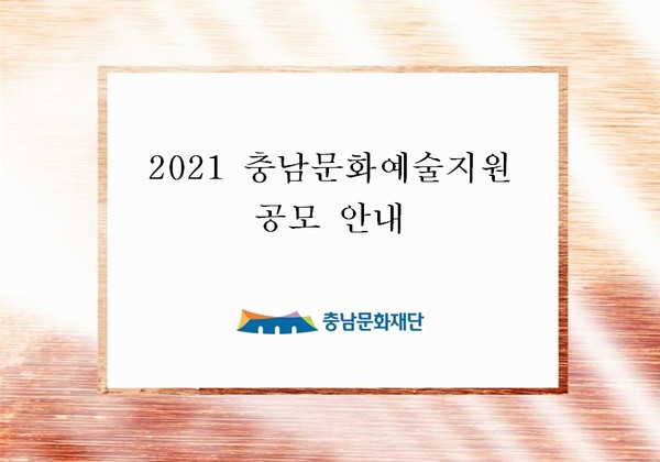 2021년 충남문화예술지원 신청은 1월 15일부터 2월 16일까지 국가문화예술지원시스템(www.ncas.or.kr)을 통해서 진행되며, 지원 신청 자격 등 자세한 사항은 충남문화재단 홈페이지 공모 공지사항을 통해 볼 수 있다.