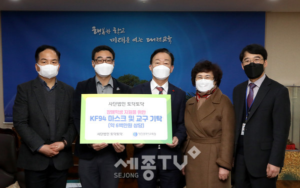 대전광역시교육청(교육감 설동호)은 1월 21일(목)에 사단법인 토닥토닥으로부터 학생용 KF94 마스크 1만장과 교구를 기탁받았다고 밝혔다.