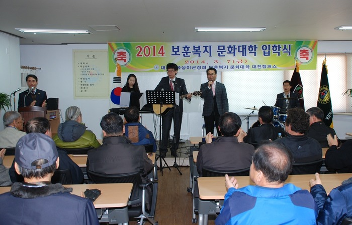 대전지방보훈청(청장 이명현) 제대군인지원센터에서는 7일 국가유공자 및 유족 등 80여명이 참석하는 ‘2014년도 보훈복지문화대학 대전캠퍼스 입학식’에 베테랑 밴드의 재능기부로 입학식 분위기를 한껏 띄웠다.