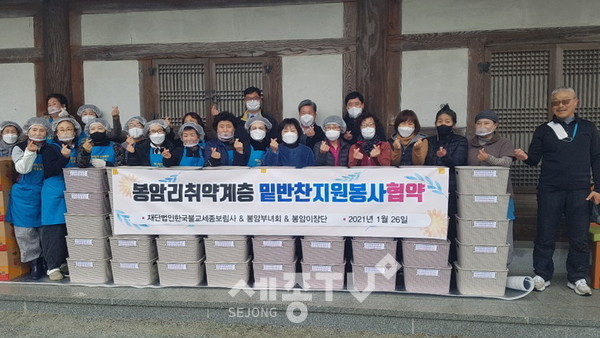 세종특별자치시 연서면 봉암리 부녀회(회장 김경옥)가 26일 봉암1리 보림사에서 ‘사랑의 반찬 봉사활동’을 전개했다.