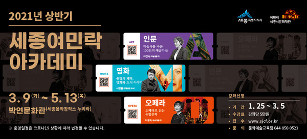 세종시문화재단은(대표이사 김종률) ‘2021년 세종여민락아카데미’ 상반기 정기강좌 수강생을 모집한다.