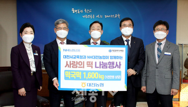 대전광역시교육청(교육감 설동호)은 1월 27일(수) 14:00, 시교육청 접견실에서 NH대전농협(본부장 윤상운, 김동수)으로부터 설맞이‘사랑의 떡국 떡’1,600kg(금일천만원 상당)을 기탁받았다고 밝혔다.
