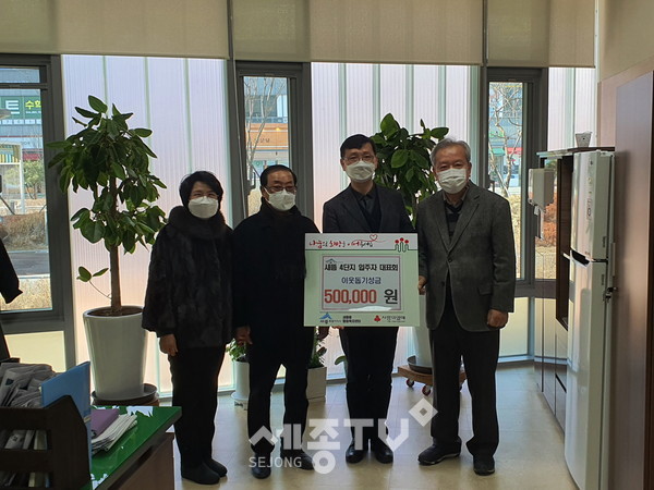 세종특별자치시 새롬동 새뜸마을4단지 입주자 대표회(회장 고양원)가 지난 29일 새롬동행정복지센터(동장 윤강욱)에서 이웃돕기 성금 50만 원을 기탁했다.