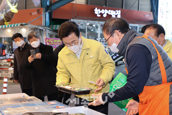허태정 대전시장이 설 명절을 앞둔 3일 오후 신도꼼지락시장과 가양도서관, 가양지구대 등 민생현장을 직접 찾았다.