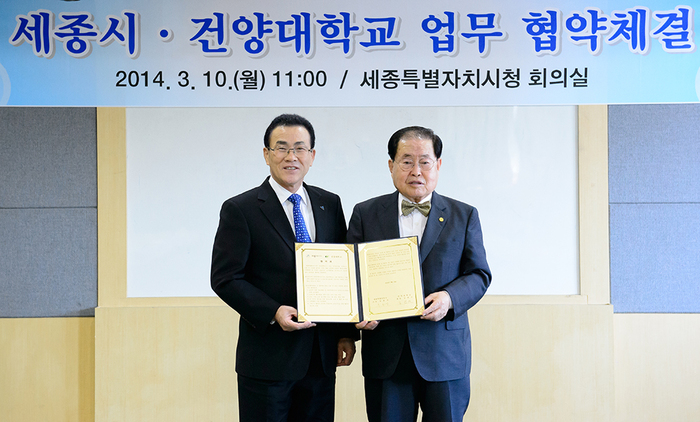 세종특별자치시(이하 세종시, 시장 유한식)와 건양대학교(총장 김희수)가 10일 오전 세종시청 회의실에서 양 기관의 협력 및 공동발전을 도모하기 위한 업무 협약을 체결했다.
