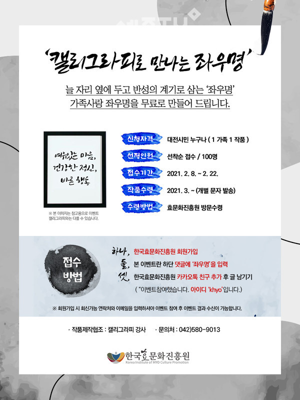 ‘캘리그라피로 만나는 좌우명’은 캘리그라피 전문가가 참여해 작품의 완성도를 높일 예정이며, 대전시민 누구나 참여할 수 있고 한국효문화진흥원 홈페이지(www.k-hyo.kr) 이벤트페이지의 안내에 따라 오는 2월 22일까지 선착순 100명 신청가능하다.