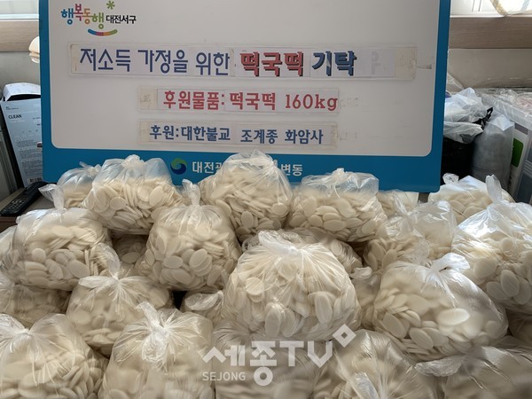 대전 서구(구청장 장종태) 변동 행정복지센터는 대한불교 조계종 화암사(주지 혜광 스님)로부터 생활이 어려운 가정을 위한 사랑의 떡국 떡 160kg을 전달받았다고 14일 밝혔다.