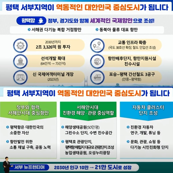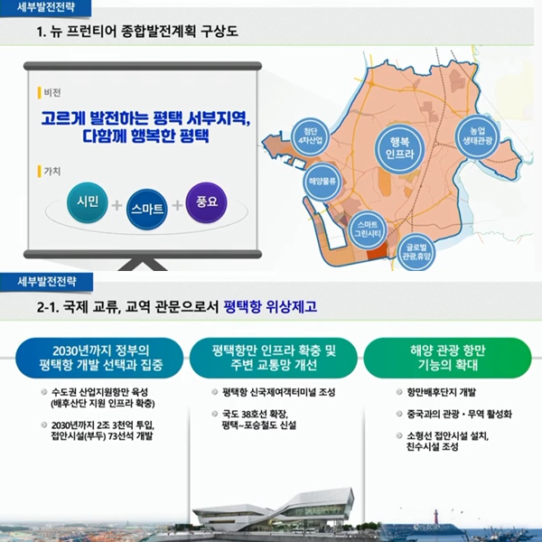 서부지역의 부진한 발전을 도약하기 위한 주요 정책을 설명하면서 2030년까지 21만 도시로 성장시켜 새로운 평택시의 중심으로 구축한다는 중장기 비전을 제시하였다.