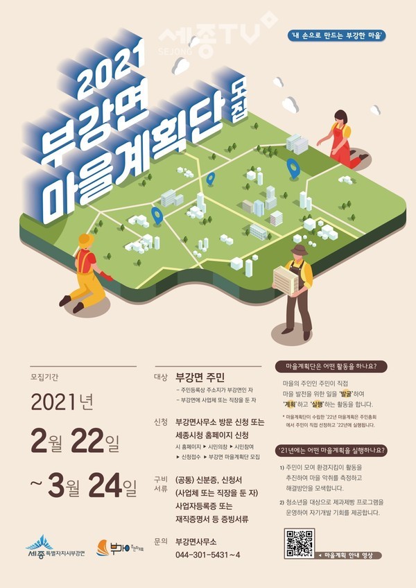 마을계획단은 부강면에 주소를 둔 주민이거나 부강면에 사업체 또는 직장을 둔 경우 신청할 수 있으며 마감일까지 부강면사무소로 방문·신청하거나 시 누리집(www.sejong.go.kr)에서 신청하면 된다.