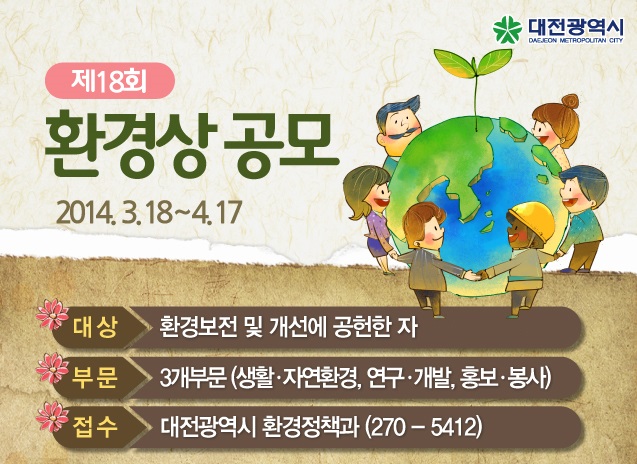 대전시는 2014년 환경의 날(6월 6일)을 맞아 ‘2014년 대전광역시 환경상’ 수상후보자를 공모한다.