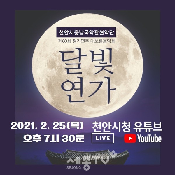 천안시가 운영하는 천안시충남국악관현악단이 정월 대보름을 맞아 2월 25일 목요일 오후 7시 30분 천안시청 유튜브를 통해 제80회 정기연주 대보름음악회 ‘달빛연가’를 공개한다.
