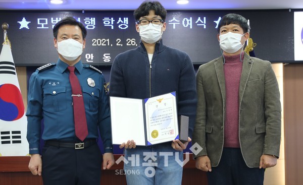 천안동남경찰서(서장 총경 백남익)는, 지난 21일(일) 은행 현금 인출기 위에 실수로 두고 간 현금 100만원을 습득 후 청수파출소에 신고하여 주인에게돌려 준 고등학생에게 26일 상장을 수여했다.