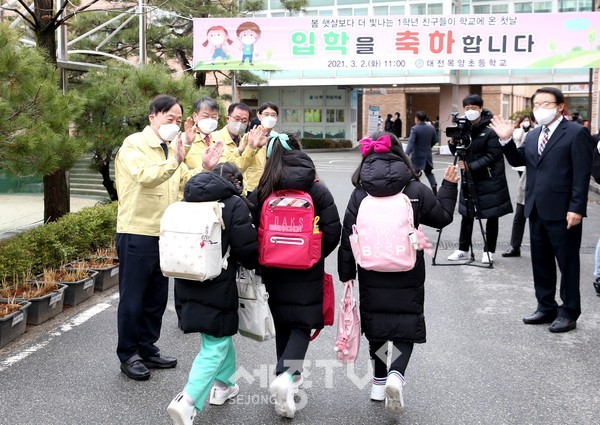 설동호 대전광역시교육감은 아침 8시 30분부터, 대전목양초 교문에서 새 학년 첫날 등교하는 학생들을 반갑게 맞이하였고, 특히 사회적 거리두기 2단계까지 매일 등교가 이루어지는 유치원 및 초등 1~2학년 학생들을 격려하였다.