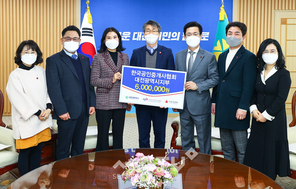 한국공인중개사협회 대전시지부(지부장 서용원)은 5일 오전, 어려운 이웃돕기 성금으로 임직원들이 모은 600만원을 사회복지공동모금회를 통해 대전시에 기탁했다. 저작권자 © SJB세종TV 무단전재 및 재배포 금지 세종TV 다른기사 보기 페이스북 트위터 카카오톡 네이버블로그 구글+ URL복사 기사공유하기