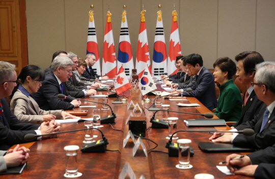 박대통령은 지난 3월11일 스티븐 하퍼 캐나다 총리와 정상회담을 갖고 자유무역협정(FTA), 에너지・자원, 과학·기술 분야