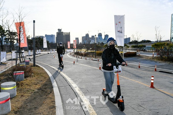 이에 시는 지난 12일 한국교통안전공단, 도로교통공단, ㈜매스아시아와 ‘스마트실증사업 연계 협약’을 체결, 세종시에 특화된 전동킥보드 안전·활성화 방안을 모색하기로 했다.