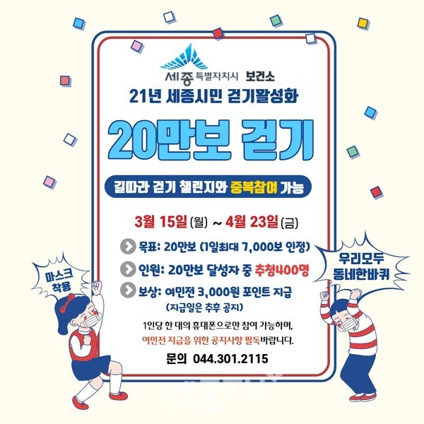 세종특별자치시보건소(소장 권근용)가 모바일 앱 ‘워크온’을 활용한 ‘3~4월 20만보 걷기 챌린지’를 운영한다.