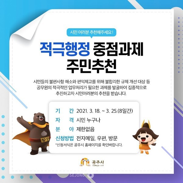 공주시(시장 김정섭)가 올해 추진할 적극행정 실행계획에 담길 중점과제 발굴 시 시민들의 추천을 받는다.
