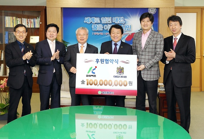 대전지역 중견 건설업체인 ㈜ 금성백조주택(회장 정성욱)은 20일 오후 시청을 방문 염홍철 시장을 만나 대전시티즌과 1억 원 후원 협약을 가졌다.