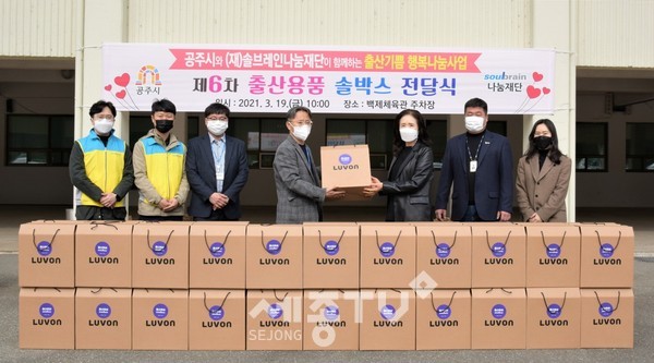 공주시(시장 김정섭)는 지난 19일 (재)솔브레인나눔재단(이사장 임혜옥)에서 ‘출산기쁨 행복나눔사업’ 일환으로 출산용품 ‘솔박스’를 시에 전달했다고 밝혔다.