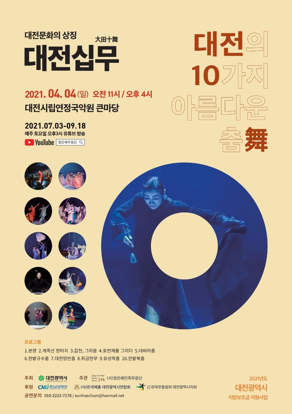 이번 공연은 연정국악원 큰마당에서 오전 11시와 오후 4시 2회에 걸쳐 공연한다. ‘대전십무’는 대전시가 주최하고 (사)정은혜민족무용단이 주관하며 충남대와 (사)한국예총 대전시연합회,(사)한국무용협회 대전시지회가 후원한다.