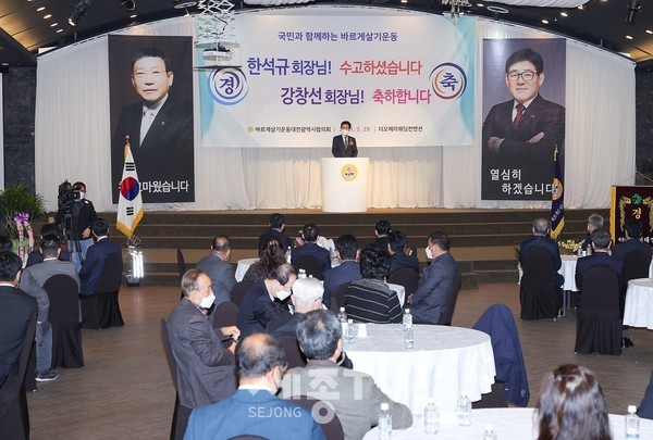 바르게살기운동대전협의회는 29일 더오페라웨딩에서 제12대 한석규 회장과 제13대 강창선 회장의 이ㆍ취임식을 가졌다.