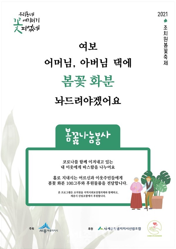 한편, 조치원읍지역사회보장협의체에서는 어려운 이웃과 함께하는 봄꽂축제 운영을 위해 4월 1일 행복지키미 임명식을 시작으로 3일 보건복지상담소 운영, 5일 복지기금 전달식, 6일 봄꽃반려식물 전달식을 추진할 예정이다.