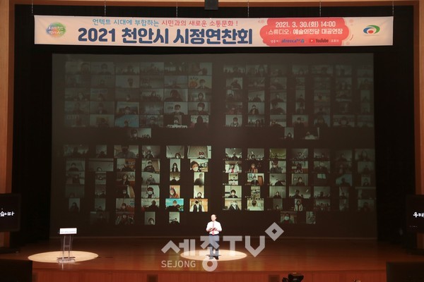 천안시가 30일 천안예술의전당 대공연장과 읍면동 회의실에서 비대면 시대에 부합하는 시민과의 새로운 소통문화 ‘2021년 비대면 시정연찬회’를 열었다.