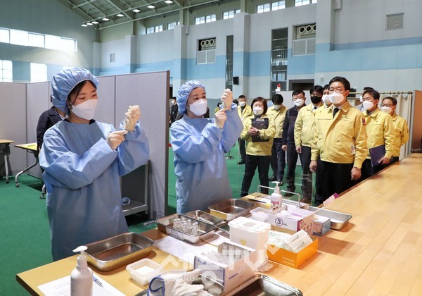 당진시가 이번 달 15일부터 시작하는 75세 이상 주민의 백신접종을 앞두고 혼선을 방지하기 위해 모의훈련을 실시하는 등 예방접종센터 운영준비에 박차를 가하고 있다.