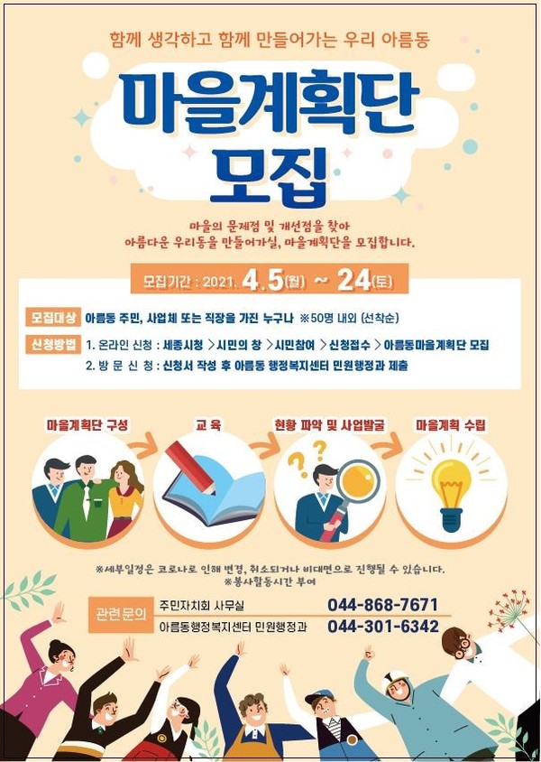 이번 마을계획단에 관한 보다 자세한 사항은 아름동 주민자치회(☎ 044-868-7671)와 아름동 행정복지센터 민원행정과(☎ 044-301-6342)로 문의하면 된다.